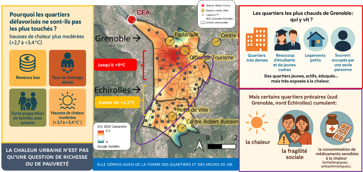Dans le cœur très dense de Grenoble, les nuits estivales montrent un écart de +3 à +4,8°C par rapport aux zones rurales de référence. Population jeune, diplômée, cadres supérieurs, logements de petite superficie… Ce portrait ne correspond pas du tout à l'image mentale que l'on se fait de la « vulnérabilité climatique ».